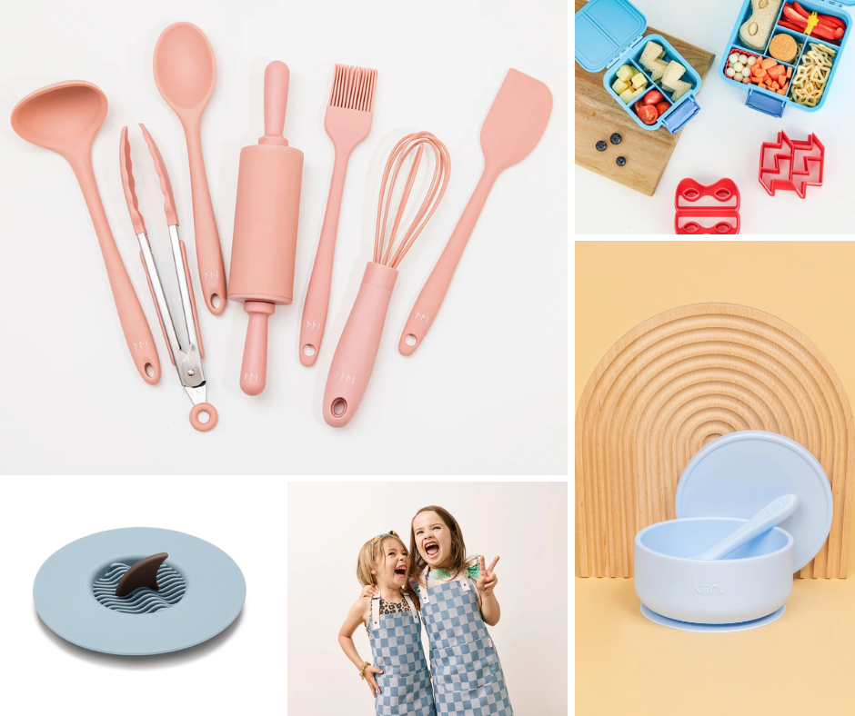 CLOCKWISE: Mini Chef Kids Cooking Kitchen Utensils Set Montessori Mates $59.99 | Lunch Punch Sandwich Cutters – Superhero Adventure Snacks $14.95 | Kiin Silicone Suction Bowl with lid + Spoon Set Kiin $28.00 | Kids and Adult Apron Set Supermarket Swap $103.95 | Sinkfin – The Drain Strainer Monkey Business $24.95