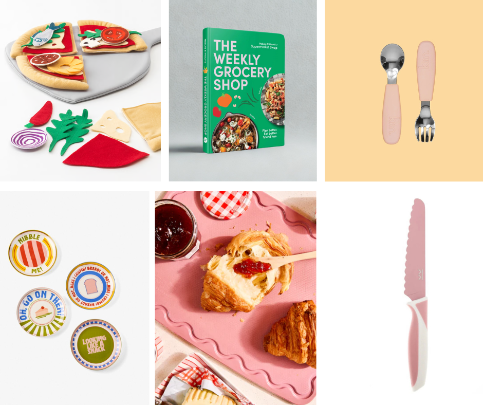 CLOCKWISE: DUKTIG 24-piece pizza set, pizza/multicolour Ikea $20.00 | The Weekly Grocery Shop Supermarket Swap $39.99 | Kiin Silicone Cutlery Set Kiin $20.00 | Kiddikutter Kids Knife Kiddikutter $19.99 each | Classique Board Maison Appret $69.00 | Sunnie Multi 4-Piece Side Plate Set Linen House $69.95