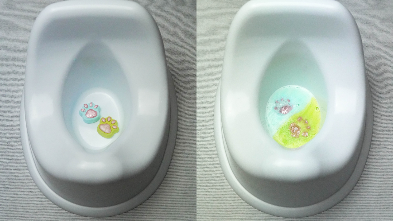 And the highlight? The Wizzle Fizzle — affectionately known as “a bath bomb for the potty”! This clever paw-shaped fizzer reacts to wee (check it out below!), turning toilet time into a colourful, sensory-rich experience that delights toddlers while easing anxiety.