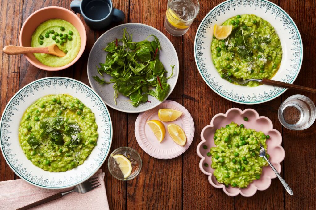 • Once the rice is done, stir in the pea purée and the reserved whole peas and cook for a further minute to heat through. Remove from the heat and add the remaining butter and the grated Parmesan.